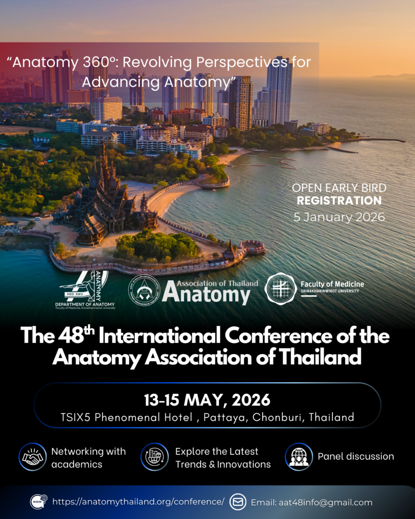 The international conference will be held on 13-15 May, 2026 at the TSIX5 Phenomenal Hotel Pattaya, Chonburi, Thailand. We are truly delighted to welcome you to this event, where we aim to foster meaningful discussions, share the latest advancements, and inspire new collaborations across various fields of anatomy, including anatomical sciences, clinical anatomy, neuroscience, cell biology, molecular biology, and anatomical education.